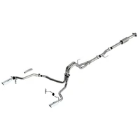 EXCEPT 3.5L V6 PowerBoost, Raptor, Tremor, and Black Appearance Package. The BORLA Cat-Back system 140864 was specifically designed to enhance the power and sound of the Ford F-150 equipped with 2.7L and 3.5L Engines. It includes 4" bright chrome on T-304 stainless steel tips and a split rear exit configuration. The entire system is made of T-304 stainless steel and utilizes computer numerical control (CNC) manufacturing techniques that ensure an accurate fit. This system features the ATAK our most aggressive sound level without any drone. It is also available with black chromed tips (part number 140864BC). There are also systems available for the 2.7L and 3.5L F-150 that offer different options for sound level, tip finish and tip Exits. Add Adapter 60556 for Crew Cab with Standard Bed (6' 7") 157.2" Wheelbase vehicles. Add Adapter 60564 for Extended Cab with Long Bed (8' 2") 164.1" Wheelbase vehicles. All this is backed by our unsurpassed Million Mile Warranty.System Features: Cat-Back System Split Rear Exit 4" Bright Chrome On T-304 Stainless Steel Tips ATAK Sound Level T-304 Stainless Steel Construction Bolt-On Installation Million Mile Warranty