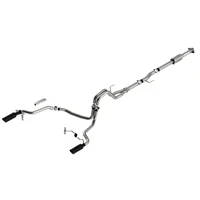 EXCEPT 3.5L V6 PowerBoost, Raptor, Tremor, and Black Appearance Package. The BORLA Cat-Back system 140864BC was specifically designed to enhance the power and sound of the Ford F-150 equipped with 2.7L and 3.5L Engines. It includes 4" black chrome on T-304 stainless steel tips and a split rear exit configuration. Using BORLA Stainless Steel Polish p# 21461 is NOT recommended with these black chrome tips. We suggest cleaning the tips with hot water and a microfiber cloth. The entire system is made of T-304 stainless steel and utilizes computer numerical control (CNC) manufacturing techniques that ensure an accurate fit. This system features the ATAK our most aggressive sound level without any drone. It is also available with bright chromed tips (part number 140864). There are also systems available for the 2.7L and 3.5L F-150 that offer different options for sound level, tip finish and tip Exits. Add Adapter 60556 for Crew Cab with Standard Bed (6' 7") 157.2" Wheelbase vehicles. Add Adapter 60564 for Extended Cab with Long Bed (8' 2") 164.1" Wheelbase vehicles. All this is backed by our unsurpassed Million Mile Warranty.System Features: Cat-Back System Split Rear Exit 4" Black Chrome On T-304 Stainless Steel Tips ATAK Sound Level T-304 Stainless Steel Construction Bolt-On Installation Million Mile Warranty