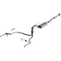 EXCEPT Tremor and Black Appearance Package. The BORLA Cat-Back system 140868 was specifically designed to enhance the power and sound of the Ford F-150 equipped with the 5.0L V8 engine. It includes 4" bright chrome on T-304 stainless steel tips and a split rear exit configuration. The entire system is made of T-304 stainless steel and utilizes computer numerical control (CNC) manufacturing techniques that ensure an accurate fit. This system features the S-Type sound that gives you a mild sound of power with no drone. It is also available with black chromed tips (part number 140868BC). There are additional systems available for the 5.0L F-150 that offer different options for sound level, tip finish and tip Exits. Add adapter 60564 for Regular Cab with Long Bed (8' 2") 141.5" Wheelbase vehicles. All this is backed by our unsurpassed Million Mile Warranty.System Features: Cat-Back System Split Rear Exit 4" Bright Chrome On T-304 Stainless Steel Tips S-Type Sound Level T-304 Stainless Steel Construction Bolt-On Installation Million Mile Warranty
