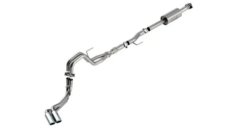 EXCEPT Tremor and Black Appearance Package. The BORLA Cat-Back system 140875 was specifically designed to enhance the power and sound of the Ford F-150 equipped with the 5.0L V8 engine. It includes 4" bright chrome on T-304 stainless steel tips and a dual side exit configuration. The entire system is made of T-304 stainless steel and utilizes computer numerical control (CNC) manufacturing techniques that ensure an accurate fit. This system features BORLA'S Polyphonic Harmonizer Technology utilizes patented units which contain pipes of different diameters and lengths to create multiple exhaust notes that harmonize to deliver a clean, rich, full-bodied sound. This sytstem is tuned for the ATAK sound that gives you an aggressive sound with no drone. It is also available with black chromed tips (part number 140875BC). There are additional systems available for the 5.0L F-150 that offer different options for sound level, tip finish and tip exits. Add adapter 60556 for Crew Cab with Standard Bed (6' 7") 157.2" wheelbase vehicles. Add adapter 60564 for Extended Cab with Long Bed (8' 2") 164.1" wheelbase vehicles. All this is backed by our unsurpassed Million Mile Warranty.System Features: Cat-Back System Dual Side Exit 4" Bright Chrome On T-304 Stainless Steel Tips ATAK Sound Level T-304 Stainless Steel Construction Bolt-On Installation Million Mile Warranty