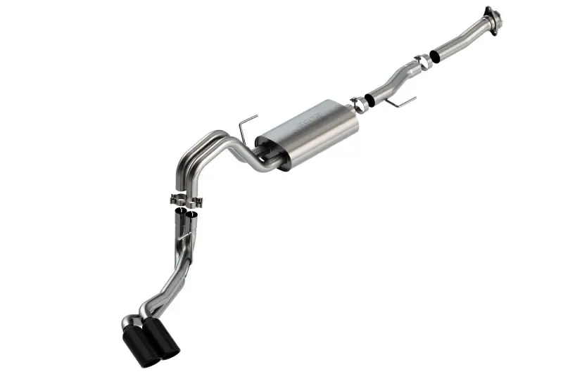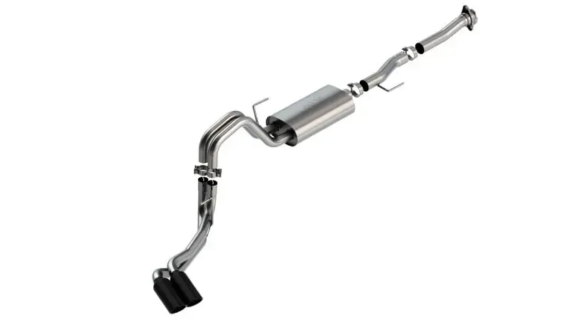 EXCEPT Tremor and Black Appearance Package. The BORLA Cat-Back system 140876BC was specifically designed to enhance the power and sound of the Ford F-150 equipped with the 5.0L V8 engine. It includes 4" black chrome on T-304 stainless steel tips and a dual side exit configuration. Using BORLA Stainless Steel Polish p# 21461 is NOT recommended with these black chrome tips. We suggest cleaning the tips with hot water and a microfiber cloth. The entire system is made of T-304 stainless steel and utilizes computer numerical control (CNC) manufacturing techniques that ensure an accurate fit. This system features the S-Type sound that gives you an aggressive sound with no drone. It is also available with bright chromed tips (part number 140876). There are additional systems available for the 5.0L F-150 that offer different options for sound level, tip finish and tip Exits. Add adapter 60564 for Regular Cab with Long Bed (8' 2") 141.5" wheelbase vehicles. All this is backed by our unsurpassed Million Mile Warranty.System Features: Cat-Back System Dual Side Exit 4" Black Chrome On T-304 Stainless Steel Tips S-Type Sound Level T-304 Stainless Steel Construction Bolt-On Installation Million Mile Warranty