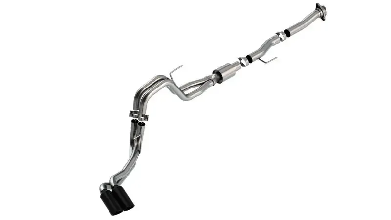 EXCEPT Tremor and Black Appearance Package. The BORLA Cat-Back system 140877 was specifically designed to enhance the power and sound of the Ford F-150 equipped with the 5.0L V8 engine. It includes 4" black chrome on T-304 stainless steel tips and a dual side exit configuration. Using BORLA Stainless Steel Polish p# 21461 is NOT recommended with these black chrome tips. We suggest cleaning the tips with hot water and a microfiber cloth. The entire system is made of T-304 stainless steel and utilizes computer numerical control (CNC) manufacturing techniques that ensure an accurate fit. This system features the ATAK sound that gives you our most aggressive sound level with no drone. It is also available with bright chromed tips (part number 140877BC). There are additional systems available for the 5.0L F-150 that offer different options for sound level, tip finish and tip Exits. Add adapter 60564 for Regular Cab with Long Bed (8' 2") 141.5" wheelbase vehicles. All this is backed by our unsurpassed Million Mile Warranty.System Features: Cat-Back System Dual Side Exit 4" Black Chrome On T-304 Stainless Steel Tips ATAK Sound Level T-304 Stainless Steel Construction Bolt-On Installation Million Mile Warranty