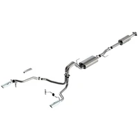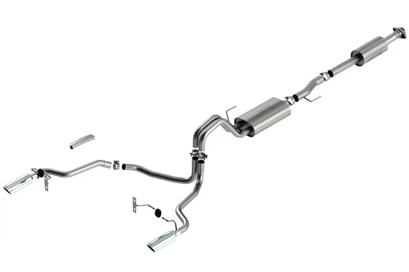 The BORLA Cat-Back system 140878 was specifically designed to enhance the power and sound of the Ford F-150 equipped with 3.3L engine. It includes 4" bright chrome on T-304 stainless steel tips and a split rear exit configuration. The entire system is made of T-304 stainless steel and utilizes computer numerical control (CNC) manufacturing techniques that ensure an accurate fit. This system features the S-Type sound level that gives you an aggressive sound level with no drone. It is also available with black chromed tips (part number 140878BC). There are also systems available for the 3.3L F-150 that offer different options for sound level, tip finish and tip exits. Add adapter 60556 for Crew Cab with Standard Bed (6' 7") 157.2" Wheelbase vehicles. Add adapter 60564 for Extended Cab with Long Bed (8' 2") 164.1" Wheelbase vehicles. All this is backed by our unsurpassed Million Mile Warranty.System Features: Cat-Back System Split Rear Exit 4" Bright Chrome On T-304 Stainless Steel Tips S-Type Sound Level T-304 Stainless Steel Construction Bolt-On Installation Million Mile Warranty