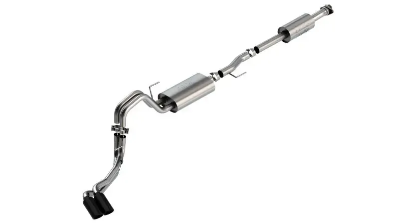 The BORLA Cat-Back system 140881BC was specifically designed to enhance the power and sound of the Ford F-150 equipped with 3.3L engine. It includes 4" black chrome on T-304 stainless steel tips and a dual side exit configuration. Using BORLA Stainless Steel Polish p# 21461 is NOT recommended with these black chrome tips. We suggest cleaning the tips with hot water and a microfiber cloth. The entire system is made of T-304 stainless steel and utilizes computer numerical control (CNC) manufacturing techniques that ensure an accurate fit. This system features the ATAK sound that gives you our most aggressive sound level with no drone. It is also available with bright chromed tips (part number 140881). There are also systems available for the 3.3L F-150 that offer different options for sound level, tip finish and tip exits. Add adapter 60556 for Crew Cab with Standard Bed (6' 7") 157.2" Wheelbase vehicles. Add adapter 60564 for Extended Cab with Long Bed (8' 2") 164.1" Wheelbase vehicles. All this is backed by our unsurpassed Million Mile Warranty.System Features: Cat-Back System Dual Side Exit 4" Black Chrome On T-304 Stainless Steel Tips ATAK Sound Level T-304 Stainless Steel Construction Bolt-On Installation Million Mile Warranty