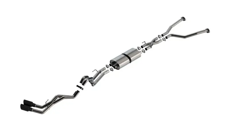 Includes Hybrid models. Will NOT fit with optional bed step. This Cat-Back system features a True Dual design with two full tail pipes that is unique in the industry. It was designed specifically for the Tundra 3.4L and delivers the classic S-Type sound without any drone. The system features a Merge X-Pipe for increased performance and improved sound. The system is finished off with 4.5" black chrome on T-304 stainless steel tips. Systems with right chrome on T-304 stainless steel tips and carbon fiber with black anodized center tips are also available. It is built with premium, high-quality austenitic T-304 stainless steel for a sharp appearance and long life. Our computer numerical control (CNC) manufacturing techniques ensures accurate fit and maximum performance. Mandrel bends ensure maximum flow & power. Best of all, BORLA stands behind every system with a Million-Mile Warranty. Just what you'd expect from the world's most experienced (and most winning) exhaust brand. System Features: Cat-Back Exhaust System 2.5" True Dual Design S-Type Sound Level No Drone Polyphonic Harmonizer Dual 4.5" Black Chrome On T-304 Stainless Steel Tips T-304 Stainless Steel Million-Mile Warranty