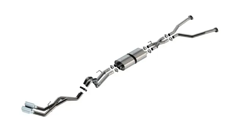Includes Hybrid models. Will NOT fit with optional bed step. This Cat-Back system features a True Dual design with two full tail pipes that is unique in the industry. It was designed specifically for the Tundra 3.4L. The system features the aggessive BORLA ATAK muffler and Polyphonic Harmonizer Technology inside the muffler assembly which utilizes patented units that contain pipes of different diameters and lengths to create multiple exhaust notes that harmonize to deliver a clean, rich, full-bodied sound without any drone. The system also features a Merge X-Pipe for increased performance and improved sound. The system is finished off with 4.5" bright chrome on T-304 stainless steel tips. Systems with black chrome on T-304 stainless steel tips and carbon fiber with black anodized center tips are also available. It is built with premium, high-quality austenitic T-304 stainless steel for a sharp appearance and long life. Our computer numerical control (CNC) manufacturing techniques ensures accurate fit and maximum performance. Mandrel bends ensure maximum flow & power. Best of all, BORLA stands behind every system with a Million-Mile Warranty. Just what you'd expect from the world's most experienced (and most winning) exhaust brand. System Features: Cat-Back Exhaust System 2.5" True Dual Design ATAK Sound Level No Drone Polyphonic Harmonizer Technology Dual 4.5" Bright Chrome On T-304 Stainless Steel Tips T-304 Stainless Steel Million-Mile Warranty