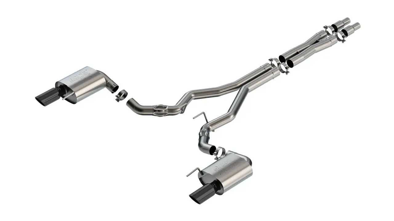 EXCEPT Convertible. This 3" diameter True Dual Borla Cat-Back system features a merge X-Pipe for increased performance and improved sound. This system is designed for use on cars WITHOUT the Active Exhaust feature. Muffler contains Polyphonic Harmonizer technology which utilizes patented units that contain pipes of different diameters and lengths to create multiple exhaust notes that harmonize to deliver a clean, rich, full-bodied sound. It features the aggressive ATAK sound and 4" black chrome on T-304 stainless steel tips. Using BORLA Stainless Steel Polish p# 21461 is NOT recommended with these black chrome tips. We suggest cleaning the tips with hot water and a microfiber cloth. Systems with bright chrome on T-304 stainless steel tips, and carbon fiber tips are also available. Borla Cat-Back and Axle-Back exhaust systems feature patented straight-through and multi-core technology designed to unleash hidden horsepower. Increased exhaust velocity adds power, driving excitement, fuel economy, and the distinctive Borla Sound of Power respected by motoring enthusiasts everywhere.