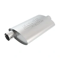 Notched necks for easy clamp-on installation using 1" wide band style clamps (clamps not included). Compact size is perfect for applications with limited space. Reversible design for installation flexibility. High-quality T-304 austenitic stainless steel will never rust. 100% welded construction for strength. Free Flow design for improved performance. High-temperature continuous-filament fiber (CFF) accoustic material for sound control. Natural mill finish can be brushed or polished prior to installation.