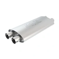 Dual inlet and dual outlet. Internal X-Pipe for increased performance and improved sound. Notched necks for easy clamp-on installation using 1" wide band style clamps (clamps not included). Reversible design for installation flexibility. High-quality T-304 austenitic stainless steel will never rust. 100% welded construction for strength. Free Flow design for improved performance. High-temperature continuous-filament fiber (CFF) acoustic material for sound control. Natural mill finish can be brushed or polished prior to installation.