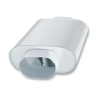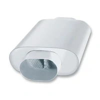 Slim Line Racing Muffler. Designed for low profile vehicles with limited space. It features a 3" x 7.88" oval body. Necks are 3.5" tubing formed into 4.13" x 2.61" oval. Reversible design for installation flexibility. Patented Multicore design for maximum power. Recommend for high horsepower applications. T-304 stainless steel will never rust. 100% welded construction for strength. High temperature T-304 stainless steel wool for sound control. There is no logo embossment on this part.