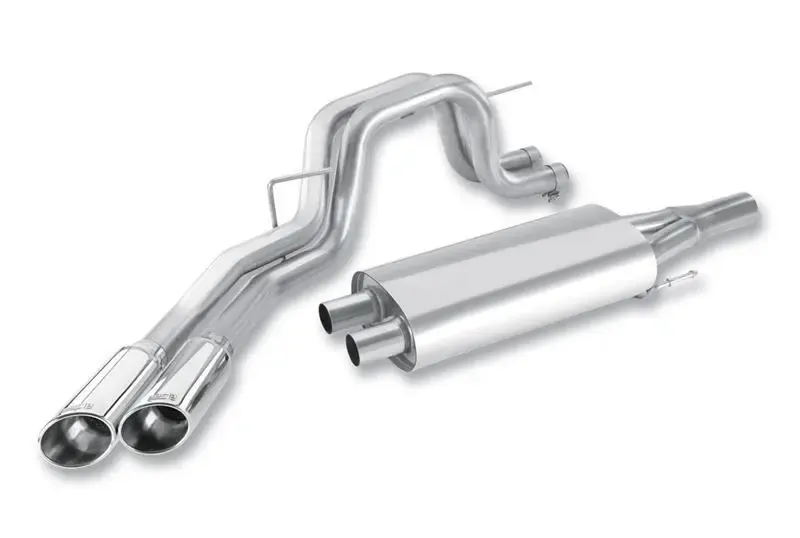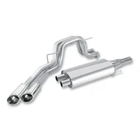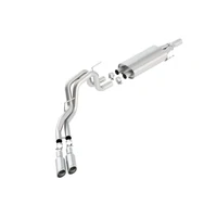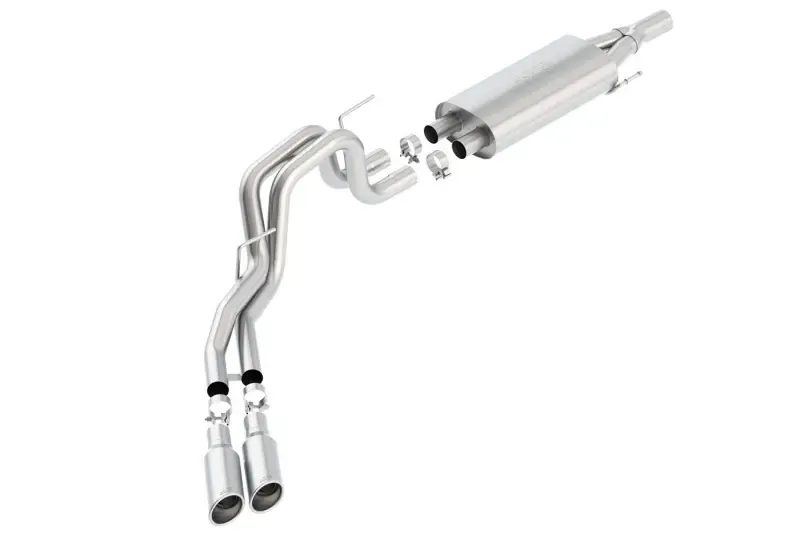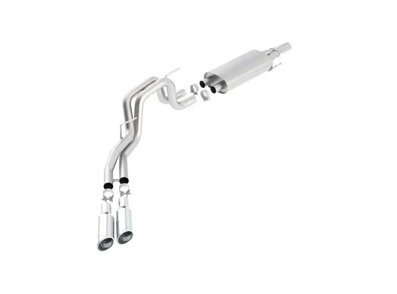 Retains factory front muffler (resonator). From the 35" BF Goodrich tires to the cast aluminum SVT control arms, the Ford Raptor has re-defined off road trucks. All that's missing to complete this street-legal Baja prerunner is a high-flow performance exhaust to unleash the engine's full potential, and who better to supply it than Borla the world's most winning exhaust. Borla's Cat-Back exhaust (PN 140383) for the F150 Raptor '10-'14 draws from decades of winning racing experience from the Baja 1000, Best In The Desert, CORR and other top venues, resulting in a world-class off road system. Utilizing Borla's patented, straight-through Multicore technology, Borla engineers were able to achieve a 13% increase in flow while reducing the overall system weight 18%! And they made it look better too. Gone are the boring factory single wall, unpolished tips. In their place are dual 4" polished T-304 stainless steel tips with handsome rolled edges that enhance the Raptors brutish good looks. High-quality T-304 austenitic stainless steel tubing is mandrel bent by computer-controlled CNC machinery to ensure maximum flow and a perfect fit. And while fit finish are great, it's the trademark Borla sound of power that really captures the essence of this premium exhaust. A hearty rumble rings through every time you get on the throttle, slightly louder than stock with no cabin resonance. Like all Borla street systems, this exhaust is backed by Borla's famed Million-Mile Warranty. That's 50 years of off-roading 20,000 miles a year! Engineering innovation, high-quality materials and state-of-the-art manufacturing make it easy to see why Borla is THE choice of performance enthusiasts worldwide. For more information on Borla products, visit www.Borlacom or call toll-free 1-877-GO Borla