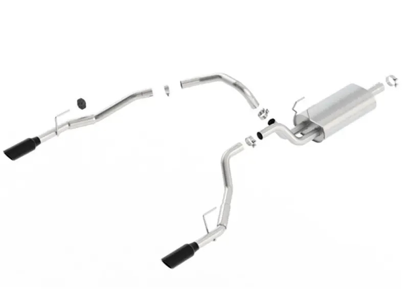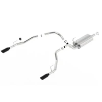 Fits through the factory bumper cut-outs (bumper has notches on the bottom). This system features a Black Chrome finish on T-304 stainless steel tips. Using BORLA(r) Stainless Steel Polish p# 21461 is NOT recommended with these black chrome tips. We suggest cleaning the tips with hot water and a microfiber cloth. BORLA(r) Cat-Back(tm) and Axle-Back exhaust systems feature patented straight-through and multi-core technology designed to unleash hidden horsepower. Increased exhaust velocity adds power, driving excitement, fuel economy, and the distinctive BORLA(r) Sound of Power respected by motoring enthusiasts everywhere. Each system is built from premium, high quality austenitic T-304 stainless steel, superior to T-400 series knockoffs (such as 409), to give you the absolute best in performance and durability. Ultra-smooth mandrel bends ensure maximum flow& power, and precision computer numerical control (CNC) manufacturing ensures an accurate fit. Best of all, BORLA(r) stands behind every system with a Million-Mile Warranty. Just what you'd expect from the world's most experienced (and most winning) exhaust brand.