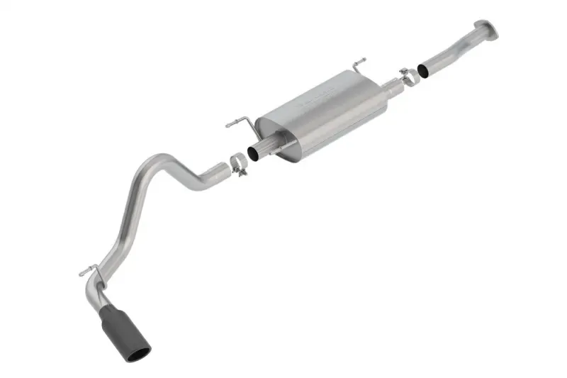 To extend this system to fit the longer Double (Crew) Cab With Long Bed (6' 1") 140.6" Wheelbase models use adapter 60593. This system features a black chrome on T-304 stainless steel tip. Using BORLA(r) Stainless Steel Polish p# 21461 is NOT recommended with these black chrome tips. We suggest cleaning the tips with hot water and a microfiber cloth. BORLA(r) Cat-Back(tm) and Axle-Back exhaust systems feature patented straight-through and multi-core technology designed to unleash hidden horsepower. Increased exhaust velocity adds power, driving excitement, fuel economy, and the distinctive BORLA(r) Sound of Power respected by motoring enthusiasts everywhere. Each system is built from premium T-304 stainless steel, superior to T-400 series knockoffs (such as 409), to give you the absolute best in performance and durability. Ultra-smooth mandrel bends ensure maximum flow& power, and precision computer numerical control (CNC) manufacturing ensures an accurate fit. Best of all, BORLA(r) stands behind every system with a Million-Mile Warranty. Just what you'd expect from the world's most experienced (and most winning) exhaust brand.