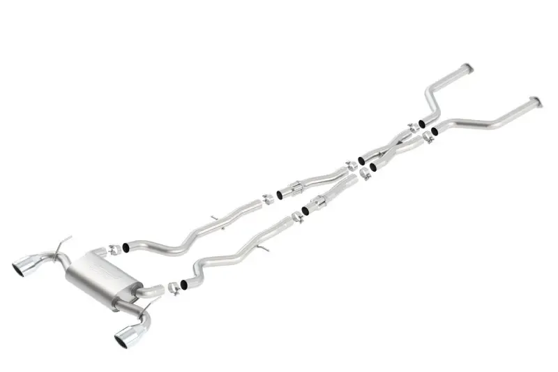 System features a X-Pipe for improved performance and polished T-304 stainless steel tips for sharp appearance. System also features BORLA(r)'S Polyphonic Harmonizer Technology which utilizes patented units that contain pipes of different diameters and lengths to create multiple exhaust notes that harmonize to deliver a clean, rich, full-bodied sound to the BORLA(r) mufflers. The mufflers then enhance this sound to the character and volume appropriate for our Touring, S-Type and ATAK(r) systems. BORLA(r) Cat-Back(tm) and Axle-Back exhaust systems feature patented straight-through and multi-core technology designed to unleash hidden horsepower. Increased exhaust velocity adds power, driving excitement, fuel economy, and the distinctive BORLA(r) Sound of Power respected by motoring enthusiasts everywhere. Each system is built from premium T-304 stainless steel, superior to T-400 series knockoffs (such as 409), to give you the absolute best in performance and durability. Ultra-smooth mandrel bends ensure maximum flow& power, and precision computer-controlled CNC manufacturing ensures an accurate fit. Best of all, BORLA(r) stands behind every system with a Million-Mile Warranty. Just what you'd expect from the world's most experienced (and most winning) exhaust brand.