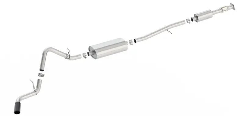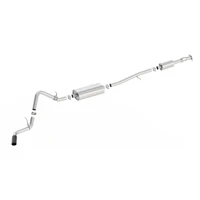 Factory Single Side Exit vehicles ONLY. The 140800BC Cat-Back(tm) system will give your 2.7L Silverado and Sierra the right sound and performance without any of the annoying drone often found in four cylinder applications. The Borla(r) S-Type Cat-Back(tm) system is tuned for flow and sound on the turbo four cylinder engine of the GM 1500 trucks. This system features a 4" black chrome on T-304 stainless steel tip. A bright chrome on T-304 stainless steel tip is also available. Using Borla(r) Stainless Steel Polish p# 21461 is NOT recommended with these black chrome tips. Add Adapter 60708 For Crew Cab with Standard Bed (6' 7") 157" Wheelbase vehicles. Ultra-smooth mandrel bends ensure maximum flow & power, and precision computer numerical control (CNC) manufacturing ensures an accurate fit. The system is constructed using premium, high quality T-304 stainless steel which is superior to 400 series. Borla(r) exhaust systems are covered under our Million-Mile warranty with the following exceptions. Borla(r) will warranty black coatings, tip finishes, and carbon fiber parts for one year.