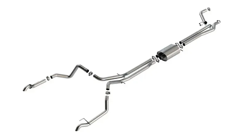 This Cat-Back(tm) system features the classic BORLA(r) S-Type sound level and turn down tail pipes, and is unique in the industry. It features a "True Dual" design which requires cutting the factory Y-Pipe. It was designed specifically for the Silverado 1500 ZR2 and Sierra 1500 AT4X and delivers great sound without any drone. Muffler contains an internal H-Pipe for increased performance and improved sound. It is built with premium, high-quality austenitic T-304 stainless steel using computer numerical control (CNC) manufacturing techniques that ensures accurate fit and maximum performance. All this without the annoying drone often associated with performance exhaust systems. Best of all, BORLA(r) stands behind every system with a Million-Mile Warranty. Just what you'd expect from the world's most experienced (and most winning) exhaust brand.