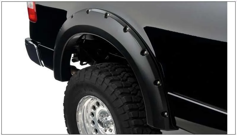 With their recessed stainless steel bolts and massive presence, Pocket Style Fender Flares are a Bushwacker original and an off-road icon. They give you the hard-core look of bolt-on flares, with no body-side sheet metal drilling required. Pocket Style Fender Flares are custom-designed for your vehicle to complement oversized tires and high-clearance lift kits. You can mount them right out of the box with their tough, OEM-style matte black finish they're UV protected so they won't chalk. You can also paint them to match or accent the body color for a factory-custom look. Pocket Style Fender Flares are made from our thick, warp-resistant Dura-Flex 2000 material and tailor-made for added durability and flexibility on the trail. When you need maximum tire coverage with minimum time and effort, it's in the pocket. Pocket Style Fender Flares from Bushwacker.