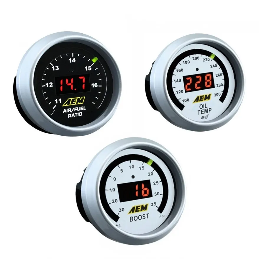 Our World-famous Wideband O2 air/fuel ratio UEGO gauge features a digital LED display and sweeping LED 'needle' that changes colors as AFR changes from rich to lean. A 52mm (2-1/16") gauge housing ensures that it will fit in most gauge pods and can be remotely mounted virtually anywhere. All AEM digital gauges feature a 0-5v analog output for use with data loggers and almost any engine management system. Each gauge comes with black and silver bezels and black and white faceplates for multiple color combinations and a custom look (a black Lambda faceplate and black and white Air/Fuel Ratio faceplates).