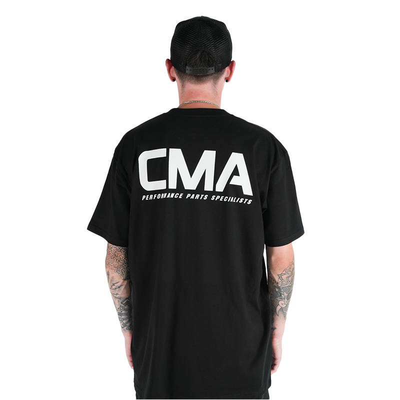 Black tee featuring the CMA logo on the chest and Performance Parts Specialists branding across the back. Designed with a relaxed fit for everyday wear. Only available at Car Mods Australia.