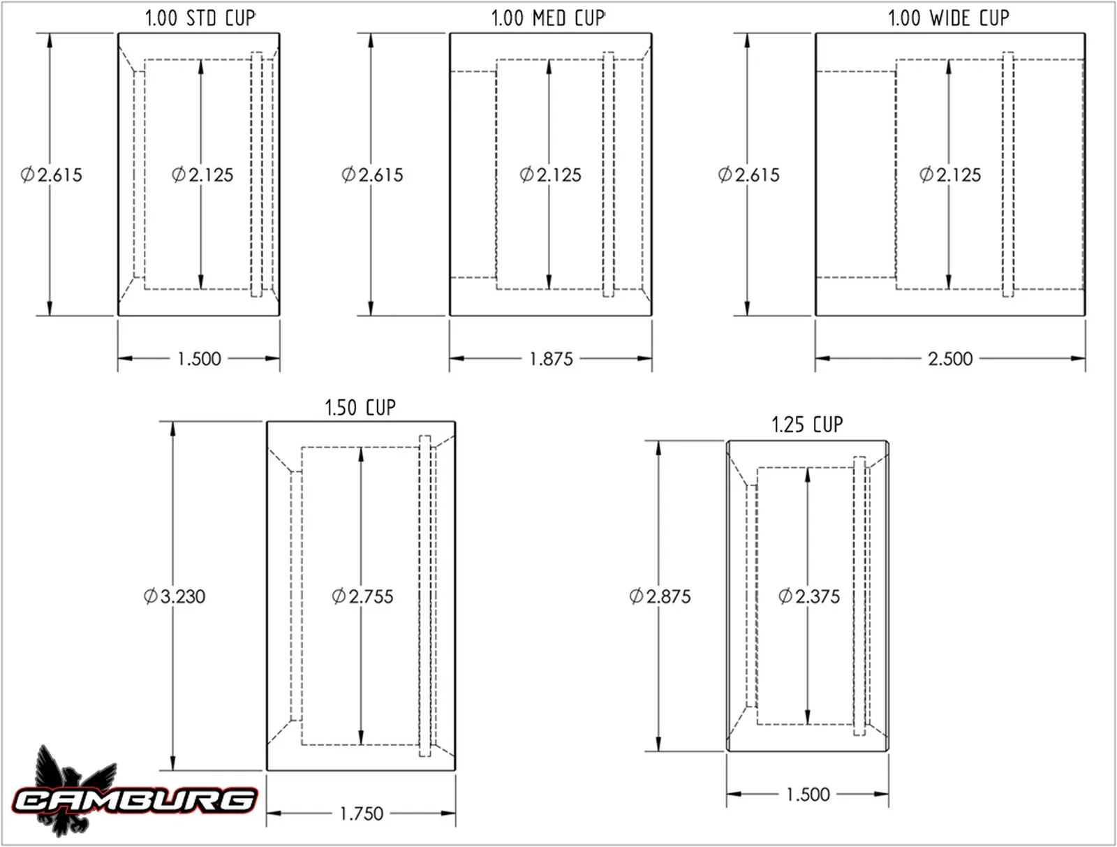 If you're looking to build your own upper/lower arms, spindles or links we have what you're looking for. We CNC machine our uniball cups in-house from US 4130 chromoly, not cheap mild steel or imported materials. Unlike most other companies we also machine the OD of the cup to remove the material scale/finish for better welding. Don't pay more for something less. We designed our cups for maximum mis-alignment and strength. These can be MIG or TIG welded and also heat-treated after final fabrication. We have 3 versions available in our 1" cups, the wider sizes are typically used for lower control arms or lower links for maximum weld attachment. The 1.25" and 1.50" come in one standard size. Refer to our sizing chart for specific dimensions. (Sold Individually | Does Not Include Snap Ring or Bearing).
