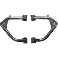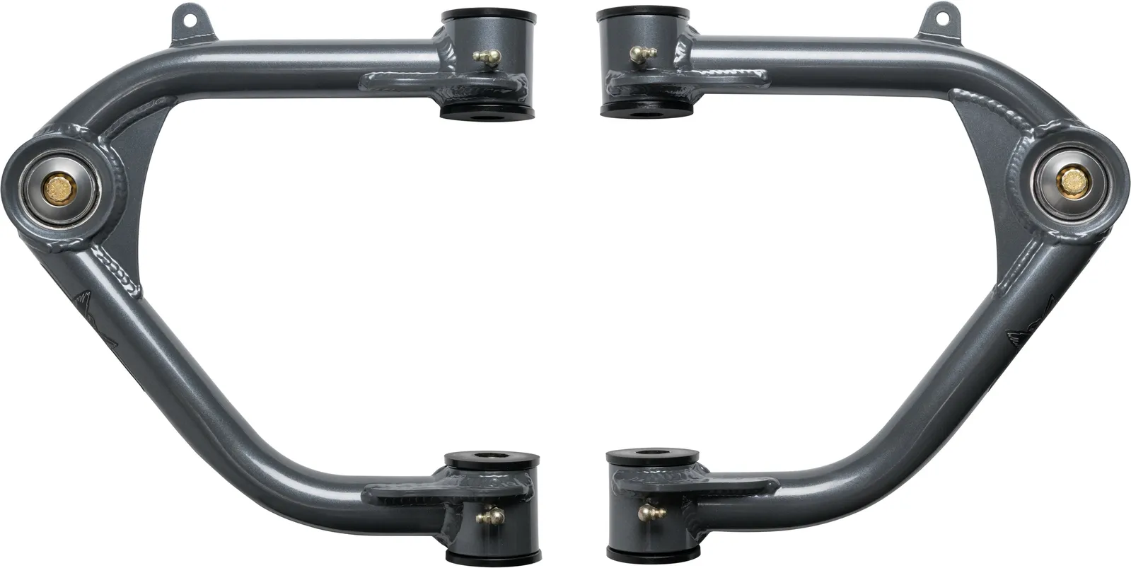 Our 1.25" uniball upper arms for '10-14 Ford Raptors offer technical improvements while keeping costs down. They use polyurethane bushings instead of heims, allowing for less maintenance. The smaller uniball allows for the use of factory offset wheels and tires. By replacing the stock ball-joint with a larger 1.25" uni-ball bearing, we increase wheel travel and durability under extreme conditions. Our arms also improve alignment, driving characteristics, and handling. Manufactured in-house, they are made from 4130 chromoly and feature laser-cut and CNC-bent tubes, MIG welding, and a steel gray powder-coating. Polyurethane frame pivot bushings with grease-able zerk fittings and FK 1.25" PTFE-lined uniballs are included. All necessary hardware is provided, and the arms are designed for 1-3" of lift. When using the factory OEM 17" wheel, a 1/4" wheel spacer may be needed for larger tires. Made in the USA.