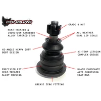 Introducing the Camburg X-Joint, a high-performance ball-joint designed for extreme conditions. Made with heat-treated materials and an improved boot design, it offers increased strength, better greasing, and longer lifespan. The dual lip seal design prevents contamination, while the grease zerk fitting allows for easy maintenance. Specifically designed for our ball-joint upper arms, the X-Joint provides optimal fit and maximum wheel travel. It corrects suspension geometry, improves handling, and offers a wider range of alignment adjustment. With a tubular construction and thicker wall tubing, it provides more tire and shock clearance. The X-Joint is pre-installed with polyurethane frame pivot bushings and comes with all necessary hardware. Made in the USA, it is compatible with 1-3" of lift and corrects camber and caster.