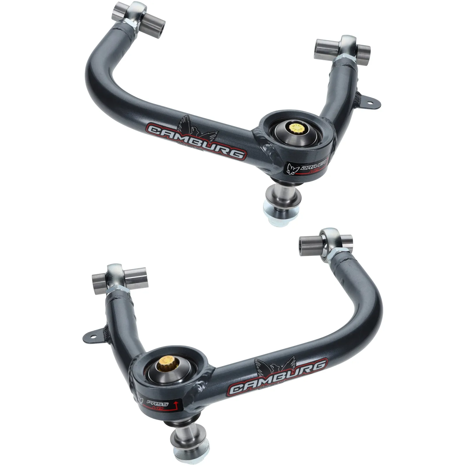 Our Camburg upper arms are designed to address the limitations of stock upper arms when lifting your truck. By replacing the stock ball-joint with a uniball bearing, we improve wheel travel and durability under extreme conditions. We also enhance the vehicle's alignment and driving characteristics by adjusting the camber curve and adding more caster. Our arms feature stronger FK 3/4" chromoly heim joints for additional camber and caster adjustment, eliminating flexing and binding. Using advanced CAD/CAM engineering software and our FARO laser scan arm, we ensure precise design and fit. Manufactured in-house, our arms undergo CNC laser cutting, bending, MIG welding, sandblasting, and powder-coating. Machined parts, including uniball mis-alignment spacers, are made in our CNC machine shop using heat-treated stainless steel. Our arms increase usable wheel travel, correct camber and caster, and eliminate weak factory ball-joints. They are made in the USA and come with all necessary hardware for installation.