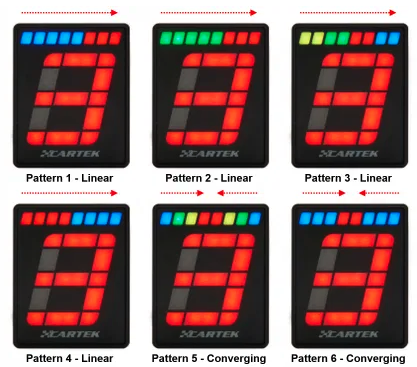 • Select from 6 LED display patterns for the Shift Light sequence and 7 Gear Indicator Digit Colours