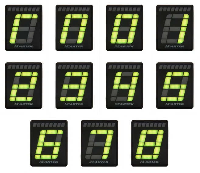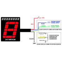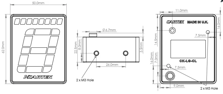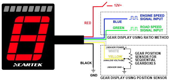 The GEAR INDICATOR from CARTEK is a dashboard mounted device that is designed to indicate to a driver the current selected transmission gear but also incorporates a sequential shift-light display which can indicate to a driver the optimum time to shift up a gear. The selected gear is indicated by a large, multi-coloured, 7 segment numerical display while the shift-light function is displayed at the upper part of the unit by 8 multi-coloured LEDs. These 8 LEDs form a display sequence that will commence at an engine speed prior to optimum and complete at precisely the optimum speed thereby giving the driver early indication to shift up before the rev limiter is reached or engine damage occurs. Not suitable for engines with older CDI Ignition systems.