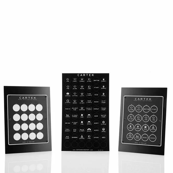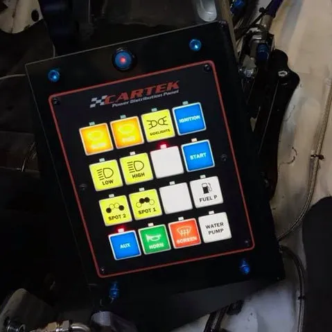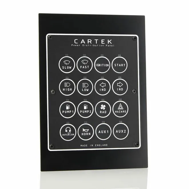 The CARTEK Power Distribution Panel is a fully integrated, fully electronic solution to power distribution in race and rally cars. Designed to replace 16 Fuses, Relays and Switches as well as a variety of control systems, these units therefore greatly simplify the wiring, reducing build time, saving weight and maximising reliability.