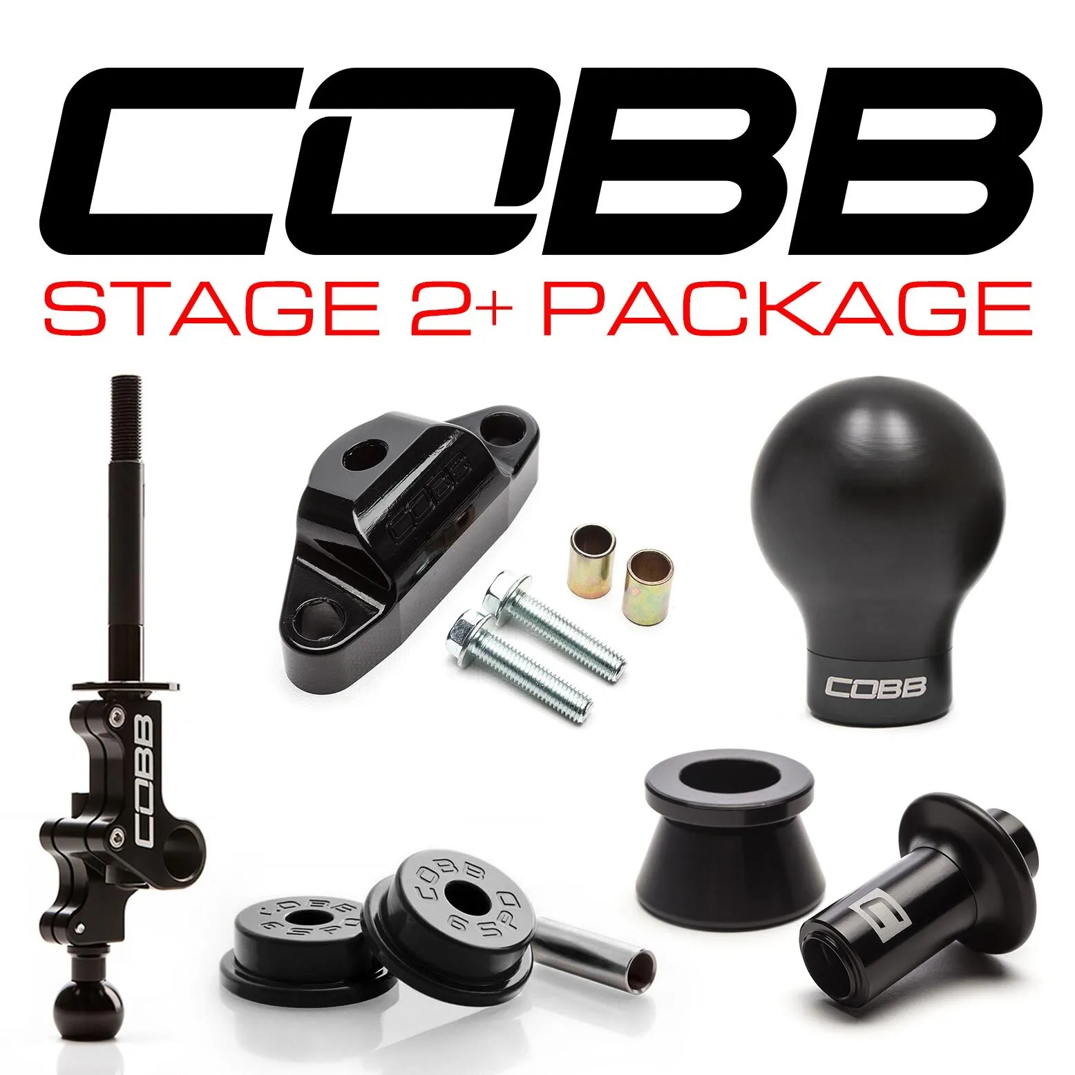 The Stage 2+ Drivetrain Package includes the COBB Tuning Subaru Rear Shifter Bushing, Subaru 6-Speed Double Adjustable Short Throw Shifter, Subaru 6-Speed Front Shifter Bushing, Subaru Reverse Lockout Pull, and the Subaru 6-Speed COBB Knob.