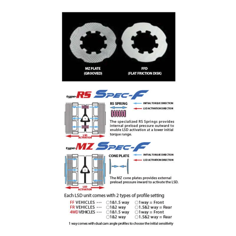 1 way LSD: Specially suited for front wheel drive cars and AWD front axle cars.Activates under acceleration, and acts as a true LSD when the throttle is off.