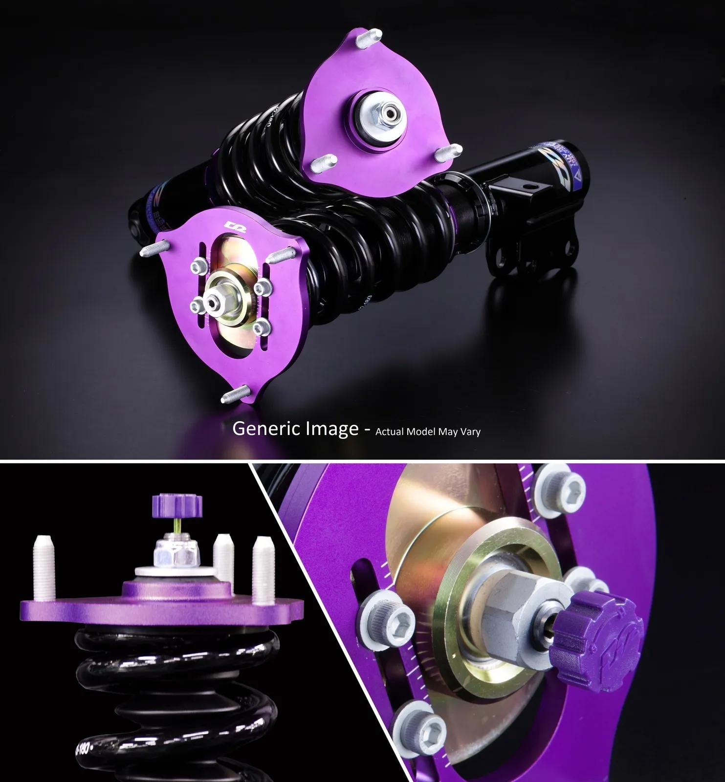 The D2 Super Racing Coilover Suspension kits are 3-way systems. There are 3 adjustment knobs in this unit. One is for adjusting nitrogen pressure, the others are for adjusting high and low damping force. The compression and rebound damping settings can be adjusted separately and above-mentioned adjustment knobs can be adjusted separately as well. There are 11664 different settings to adjust.