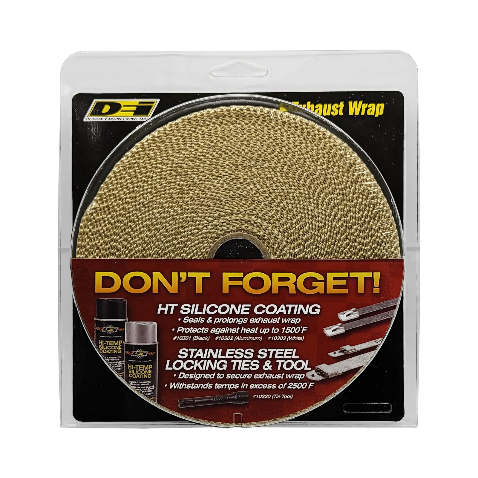 Glass Fiber Exhaust Wraps solve the problem of extreme underhood heat and improve exhaust system performance. An important first step in reducing unwanted and power-robbing under hood heat is wrapping headers and down pipes. Less under hood radiant heat results in a cooler air charge for improved performance and keeping exhaust gases hotter within the exhaust system helps in decreasing exhaust density & increases exhaust flow. Design Engineering Stainless Steel Locking Ties are the perfect way to fasten exhaust wrap for a easy, clean and professional installation. Reduce under hood temperatures a realistic 50% Decreases exhaust density & increases exhaust flow Improves horsepower Withstands 1200°F direct/2000°F radiant Only exhaust wrap with installation guide lines Added durability and heat retention NOTE: Design Engineering HT Silicone Coating spray is highly recommended for DEI glass fiber wrap to penetrate, seal, protect and prolong the lifespan of exhaust wrap. NOTE: Wrapping of the catalytic converter is not recommended, as overheating can lead to reduced lifetime of the converter. Instead, try our Corvette Catalytic Converter Shield or create your own shield using our Floor & Tunnel Shield II(TM). Note of Caution:Wrap is not designed to be moved or removed after it has been heat cycled. After the fibers have been heated, they lose their initial flexibility. This does not reduce the thermal properties of the exhaust wrap. Be aware of this before you decide to remove the wrap. For this reason, you should avoid wrapping any flex-pipes or flex-joints.
