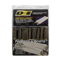 Titanium Protect-A-Boots(TM) XL are the latest in thermal protection technology for spark plug boot protectors. Developed from a unique material mined from lava rock stranded and woven into a proprietary weave for added durability and strength yet is pliable enough to provide a universal fit for straight or angled boots. Titanium Protect-A-Boots XL are naturally resistant to heat, chemicals, abrasions and contaminants, and are engineered to withstand temperatures up to 1800F (983C) of direct heat. High horsepower engine compartments are known for extreme heat that can put spark plug boots and wires at risk. With excessive heat generated from the exhaust manifold and headers the ignition system is vulnerable to the potential of burning hardening and cracking of ignition wires and boots that could lead to arching engine misfire and potential ignition system failure. Titanium Protect-A-Boots XL with LR technology are engineered to handle extreme heat, providing the ultimate protection for todays high voltage ignition systems for many applications including automotive marine and powersports. The color and weave work together to give DEIs Titanium Protect-A-Boots XL a cool carbon fiber appearance that looks great under the hood - ideal for race, street show cars and off road vehicles. Ultimate protection for spark plug boots and wires Withstands heat up to 1800F (983C) Universal-fits most straight or angled boots Strong, durable and long lasting construction Resistant to chemicals, abrasions Cool carbon fiber look 8in extra large boots No restricting steel ring PERFECT FOR LS MOTORS!