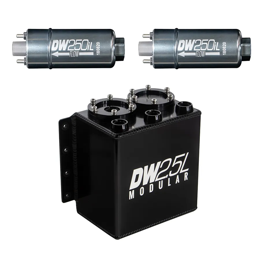 The name “DeatschWerks” is synonymous with application-specific fuel system solutions. So what happens when we create a universal product? We design it with maximum flexibility, user-friendliness, and tech support. The DW Modular Surge Tank was developed specifically for racecars and high horsepower applications where drop-in-fitment isn’t always the best approach. Highly modified vehicles have different needs, which often require complete fuel system overhaul as opposed to working within the confines of the OE fuel system. Our modular system is cost-effective in that it can grow with your build. One basic set of components can be configured to support from 500hp to over 1500hp. The system comes with all the extra parts needed for this adaptability plus we offer excellent technical documentation (DW2.5L Tech Sheet, DW3.5L Tech Sheet) to help you get your system set up right the first time, every time.