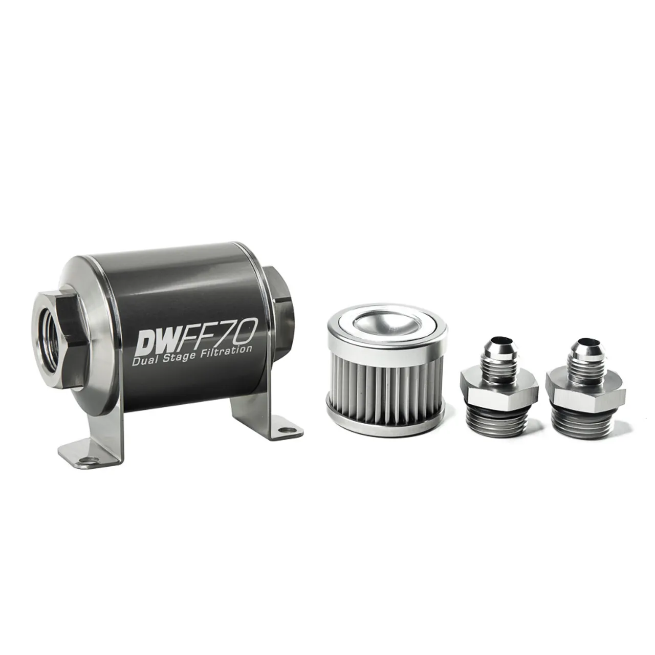 In-line fuel filter element and housing kit, stainless steel 10 micron, -6AN, 70mm. Universal