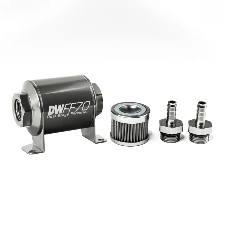 In-line fuel filter element and housing kit, stainless steel 40 micron, 3/8in hose barb, 70mm. Universal