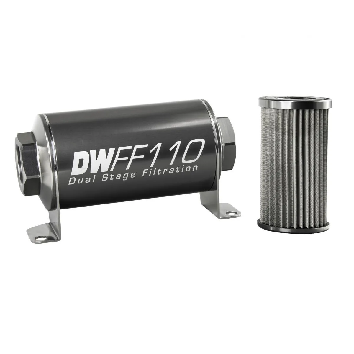 DW in-line fuel filters are available in several formats to fit your filtration needs. Two EFI-specific pore sizes are available (10u and 100u) for pre-pump or post-pump fitment. Each pore size is available in three different housing sizes (70mm, 110mm, and 160mm) to accommodate your flow, service interval, and space requirements. All housings are anodized T6061 with -10An ORB inlets and outlets. DW also offers a unique surge tank fuel filter that threads directly onto the 250iL or 350iL in-line pump.