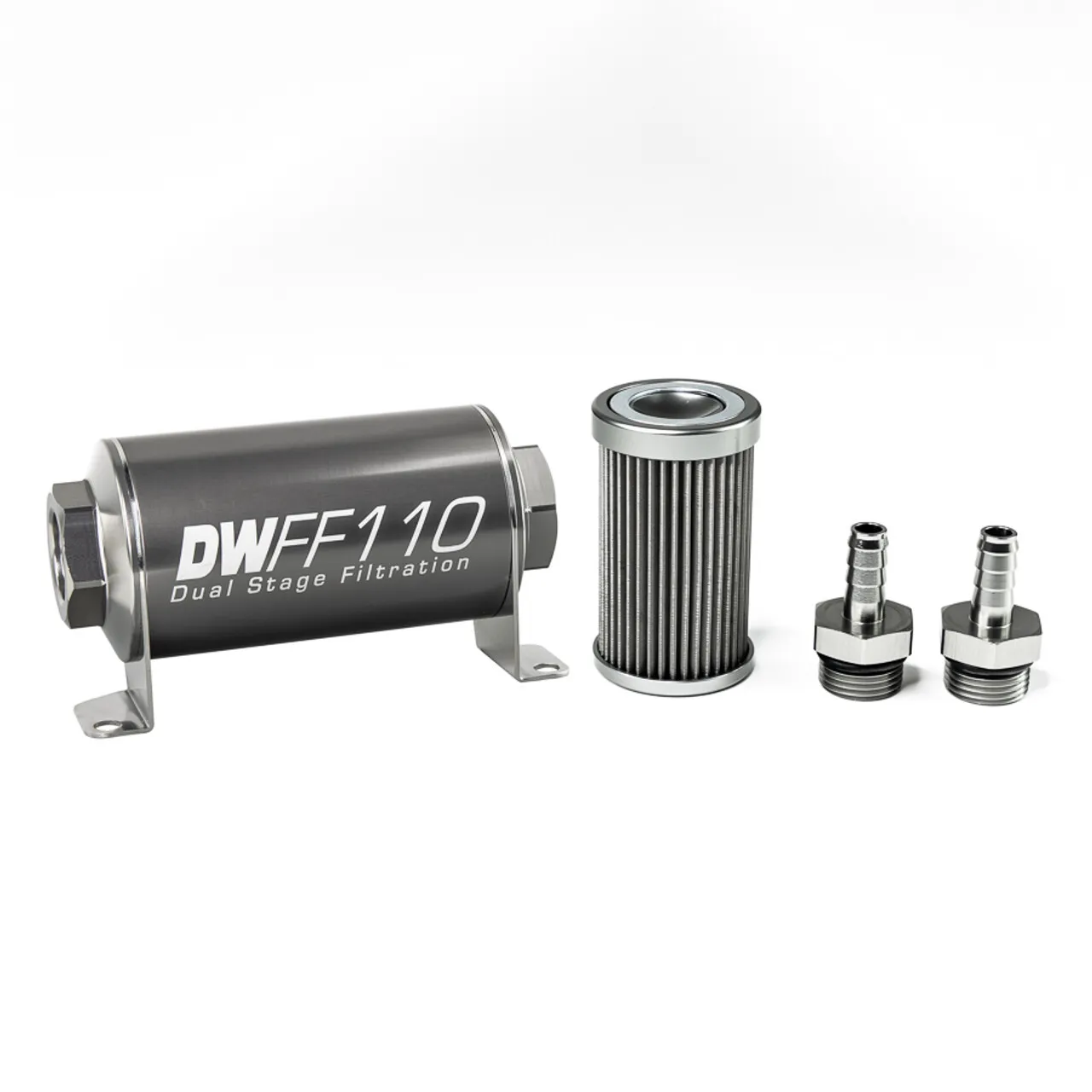 In-line fuel filter element and housing kit, stainless steel 40 micron, 3/8in hose barb, 110mm. Universal