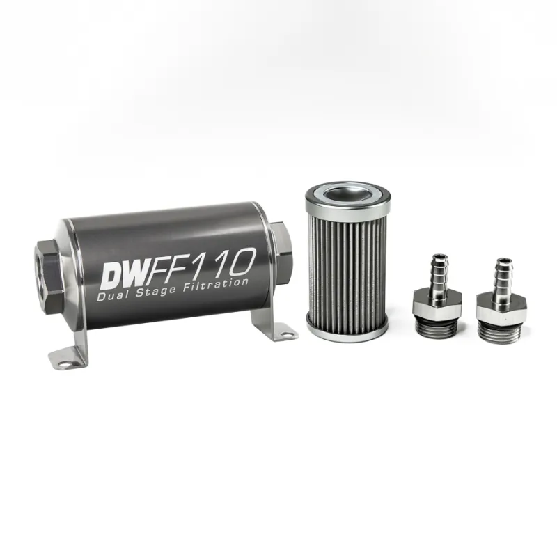 In-line fuel filter element and housing kit, stainless steel 40 micron, 5/16in hose barb, 110mm. Universal