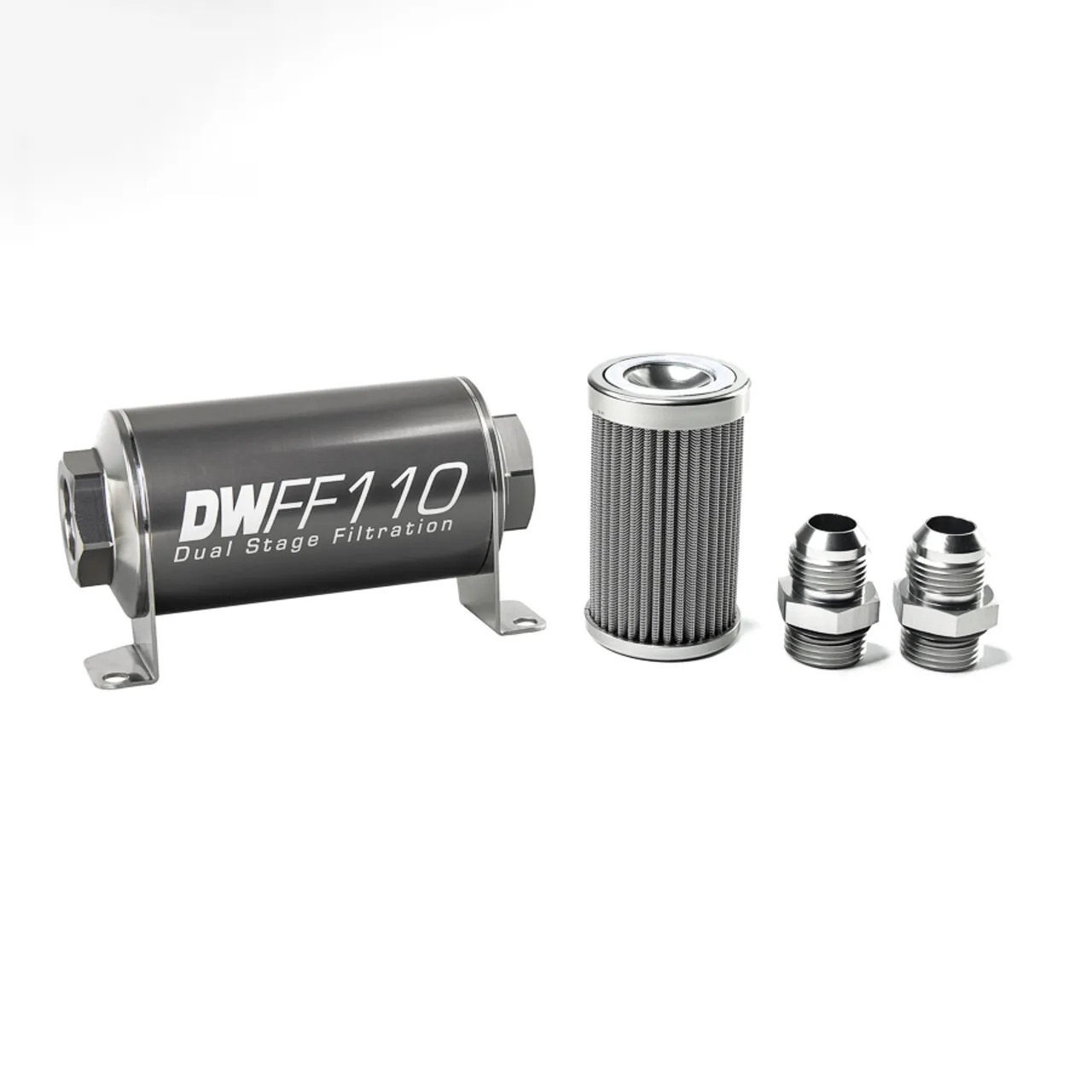 In-line fuel filter element and housing kit, stainless steel 100 micron, -10AN, 110mm. Universal