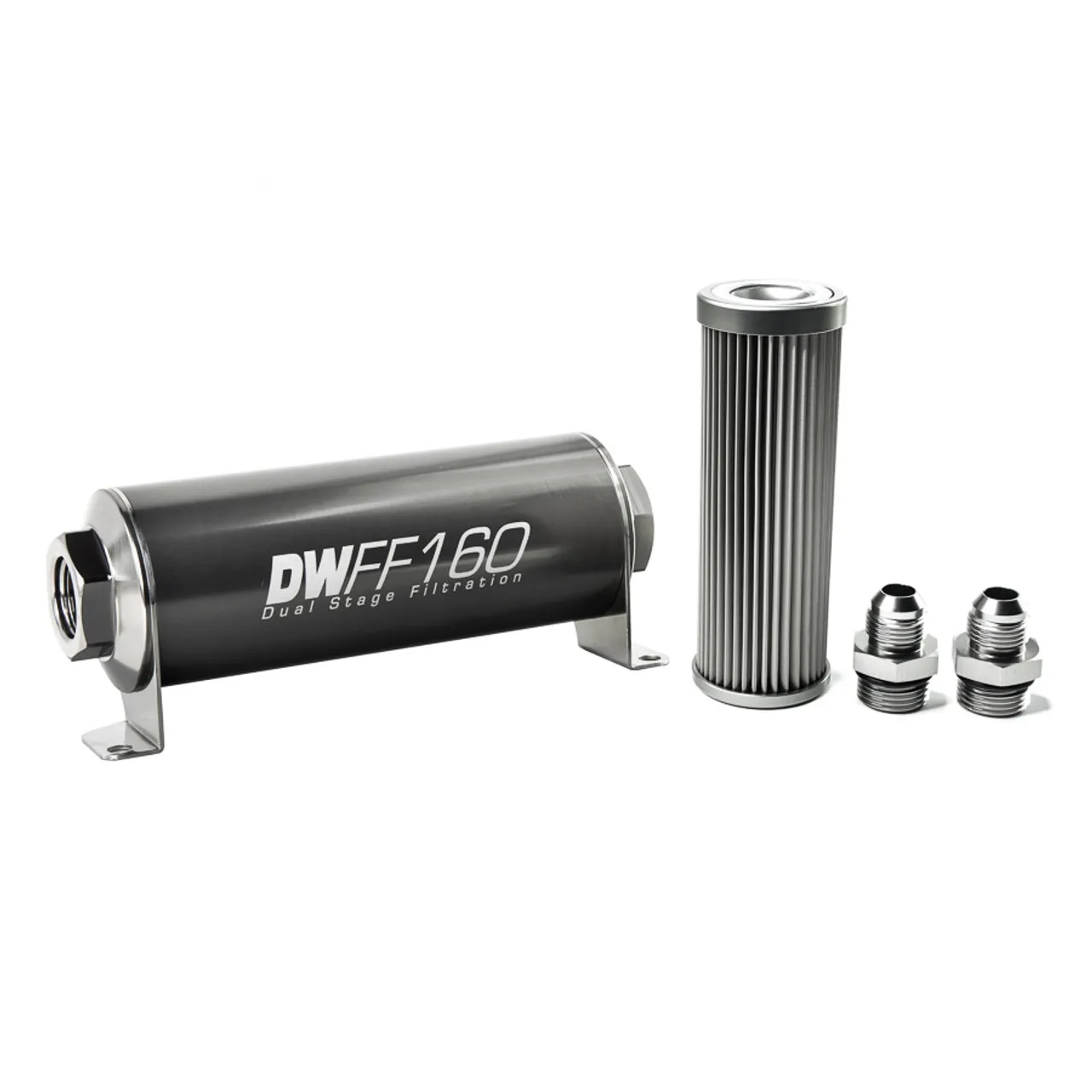 In-line fuel filter element and housing kit, stainless steel 10 micron, -8AN, 160mm. Universal