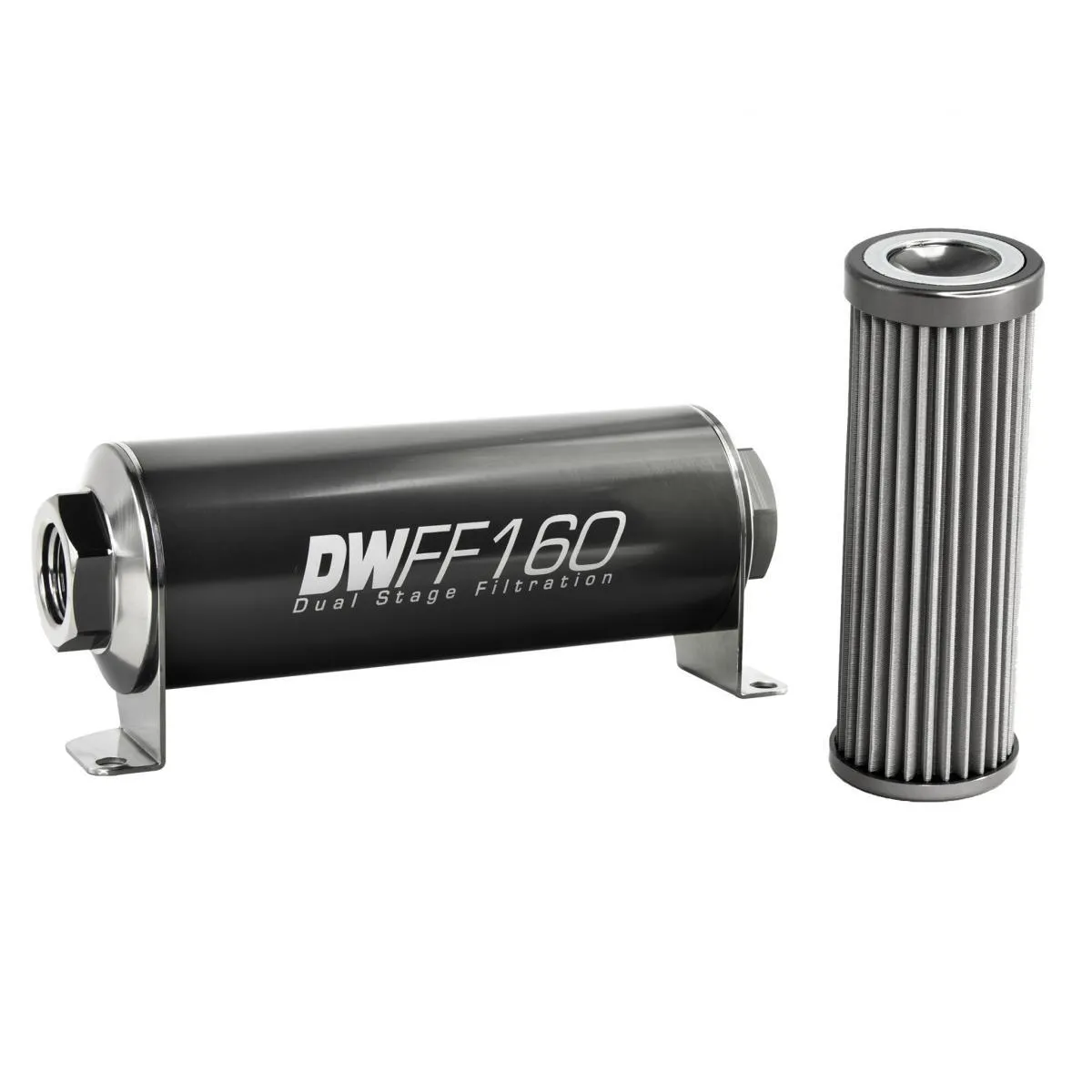 DW in-line fuel filters are available in several formats to fit your filtration needs. Two EFI-specific pore sizes are available (10u and 100u) for pre-pump or post-pump fitment. Each pore size is available in three different housing sizes (70mm, 110mm, and 160mm) to accommodate your flow, service interval, and space requirements. All housings are anodized T6061 with -10An ORB inlets and outlets. DW also offers a unique surge tank fuel filter that threads directly onto the 250iL or 350iL in-line pump.