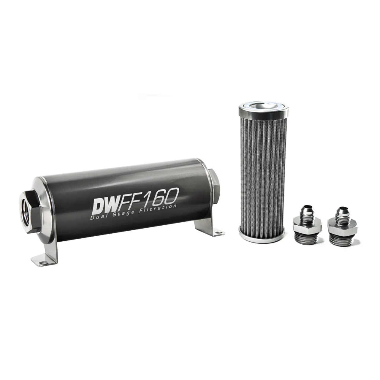 In-line fuel filter element and housing kit, stainless steel 100 micron, -6AN, 160mm. Universal