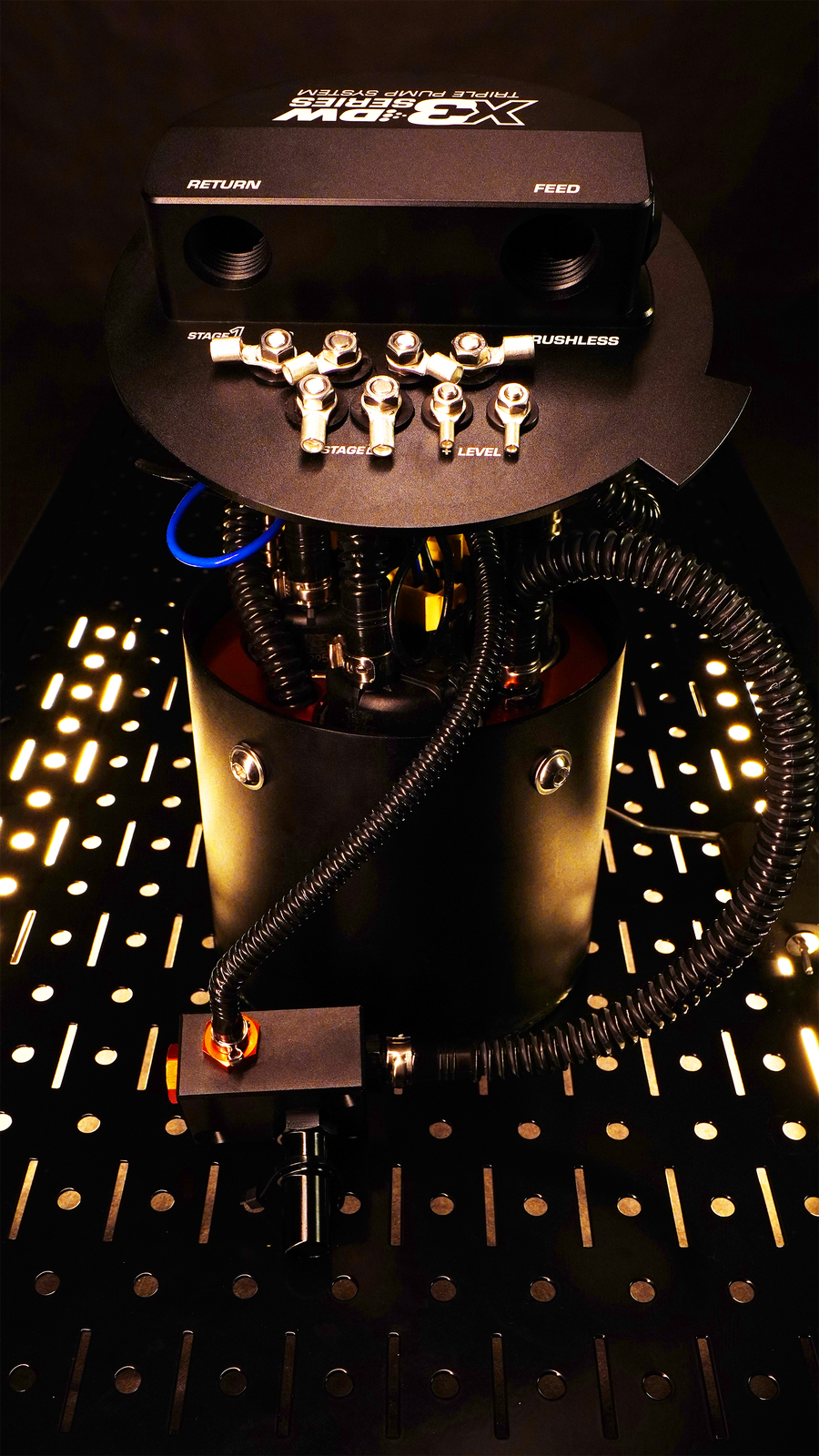 X3 Series Fuel Pump Module with triple DW400 fuel pumps and PTFE plumbing kit for 2011-24 Ford Mustang