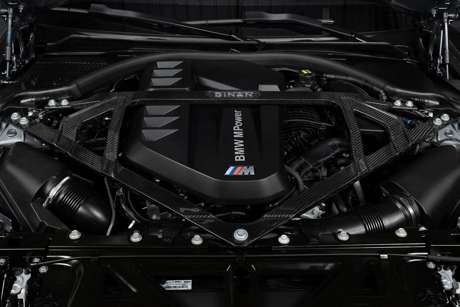 The imposing carbon fiber brace can be installed in a matter of minutes and used in conjunction with either the stock or Dinan intake systems. While the brace was designed to specifically tie into the latter for a harmoniously balanced and unified appearance the brace can also stand on its own and elicit nearly as equally an impressive visual.