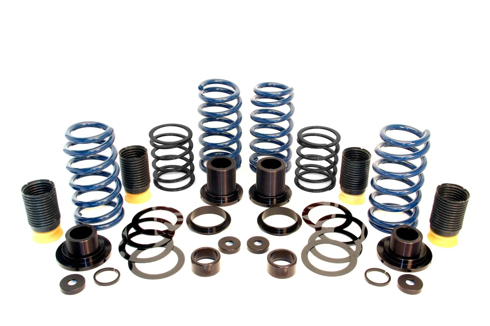 Dinan's design keeps the factory Electronic Damper Control shocks in place and implements threaded collars to allow the user to change the ride height. The end result is a sleek lowered stance that provides improved handling to go along with its stunning visual appearance. The springs combined with progressive bump stops and other components increase travel that allows the car to be lowered up to a 1.25" (1.125" on the M6). Suspension packers are included to fine-tune handling and comfort by changing the clearance of the progressive bump-stops something no respectable racecar is without. Components are machined from 6061-T6 aluminum and black anodized for appearance and corrosion protection.