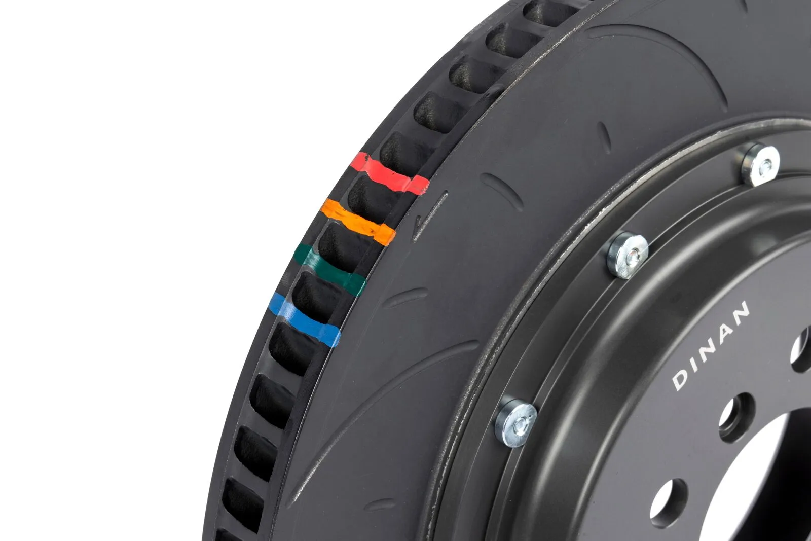 Dinan's 370x32mm 2-piece 4-piston Big Brake Kit (BBK) is an ultra-high-end solution for maximum stopping power. Each feature-packed solution is specifically tailored to your vehicle and provides exceptional stopping-power in a wide operating range from daily driving to professional racing. Because of this, the system provides the correct brake bias and integrates seemlessly with the ABS and stability systems which is critical under emergency braking situations. This upgrade handily out-brakes, out-lasts, and out-performs any non-vehicle application specific OEM swap kits, and rivals much more expensive top-tier systems. Whereas most systems on the market either make heavy sacrifices to either look fancy, cut weight, or cut costs, the Dinan system is designed to simply brake better, last longer, and stand the test of time!