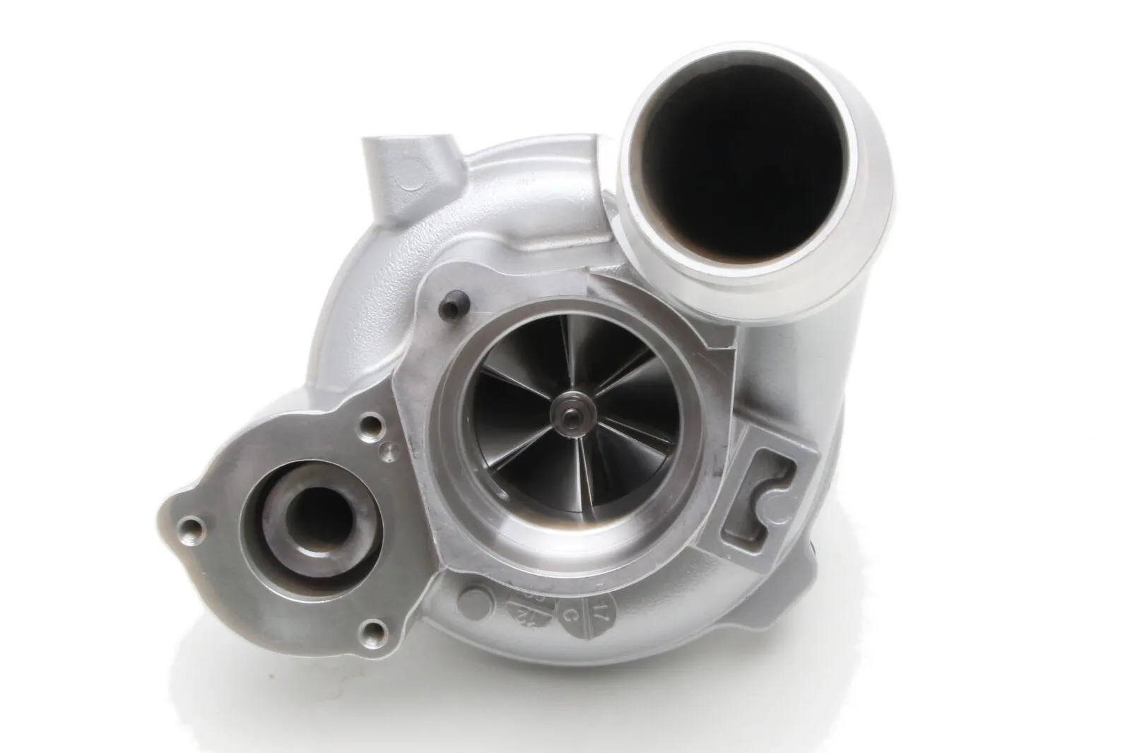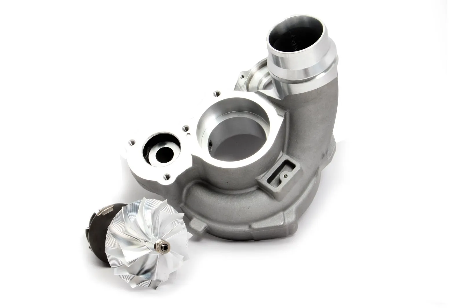 - Larger billet compressor/impeller wheel that allows ~30% greater flow over stock which then enables additional boost to be realized while retaining efficiency.